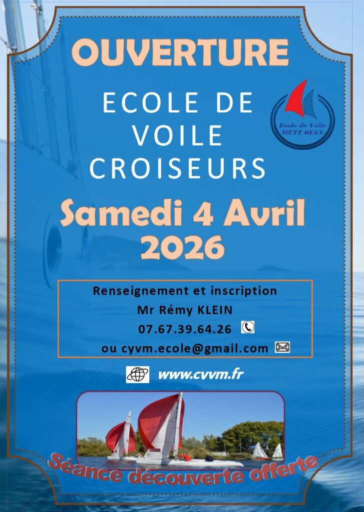 L’école de voile du C.Y.V.Moselle ouvrira ses portes le samedi 4 Avril 2026 à 14h. N’hésitez pas à nous contacter ou à nous rendre visite. Une séance découverte de la voile est possible avant de vous lancer dans l’aventure. Rassurez vous, il n’y a pas d’âge pour débuter la voile.
